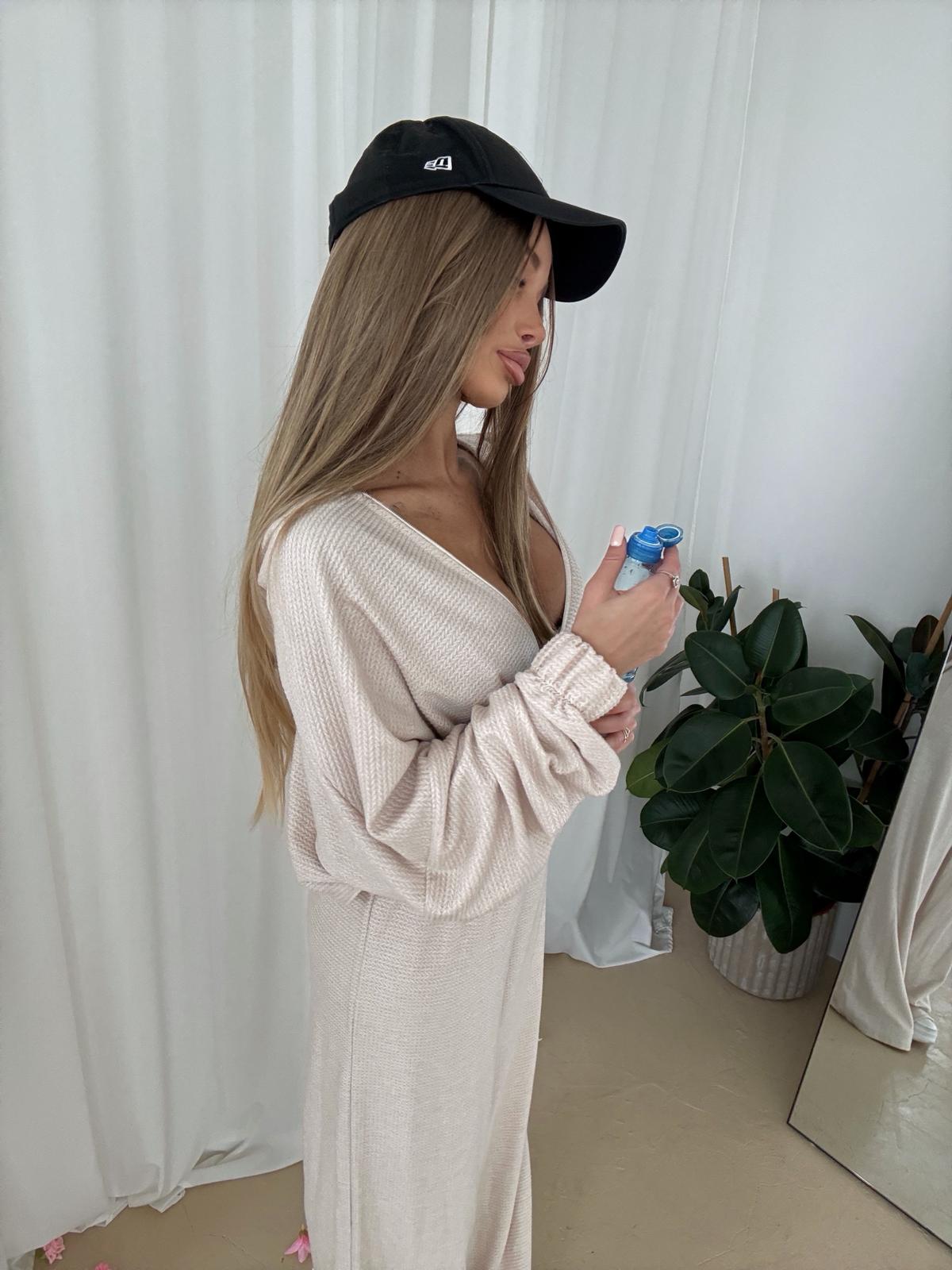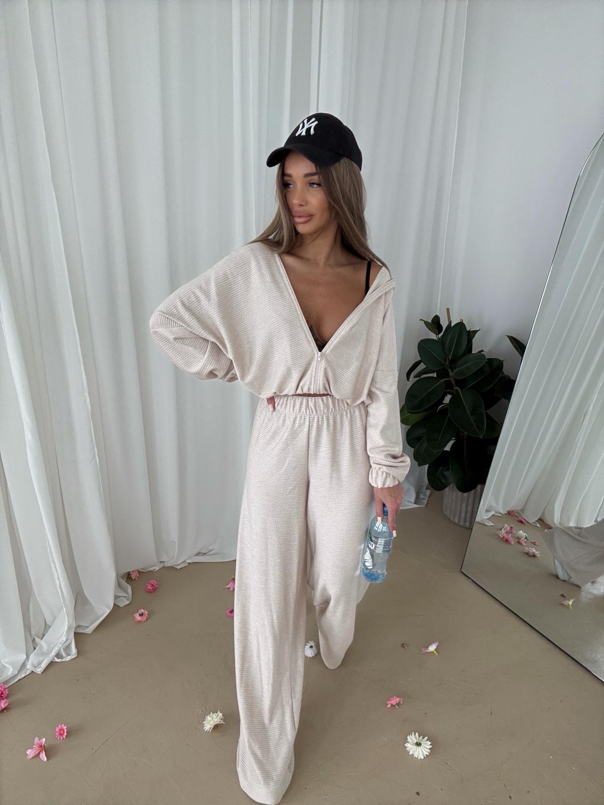2-częściowy komplet od polskiego producenta z dobrej jakości materiału w jodełkę. Komplet składa się z bluzy zapinanej na zamek oraz spodniami z prostą nogawką oraz wysokim stanem.
