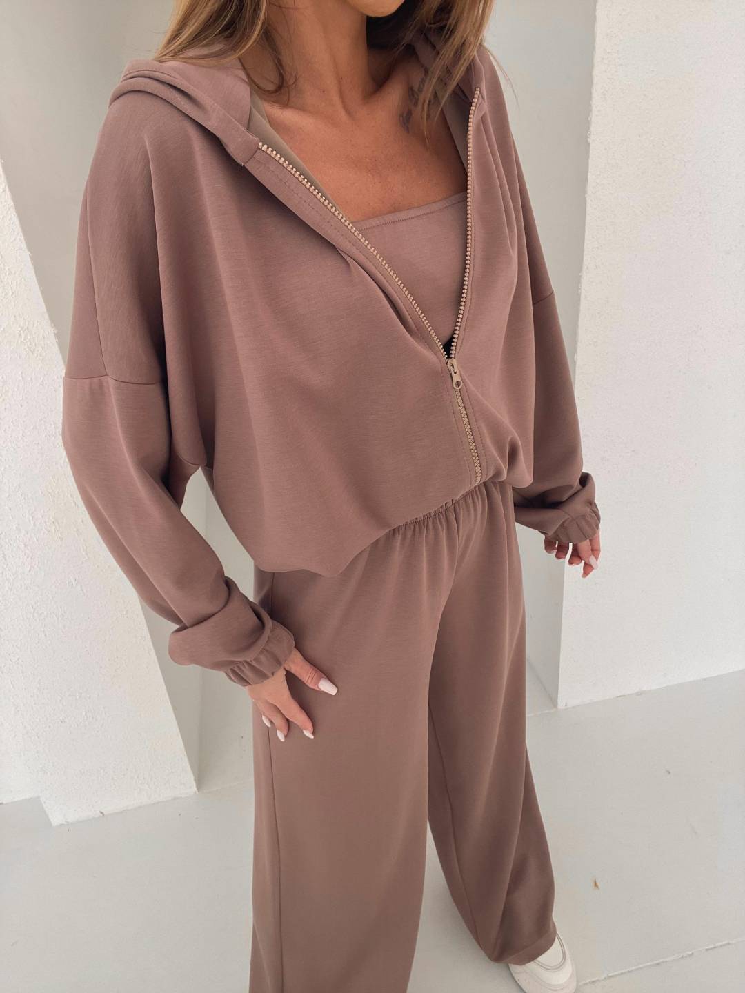 Komplet 3-częściowy składający się z topu, bluzy zapinanej na zamek z kapturem oraz spodni z gumką w pasie i prostą nogawką.