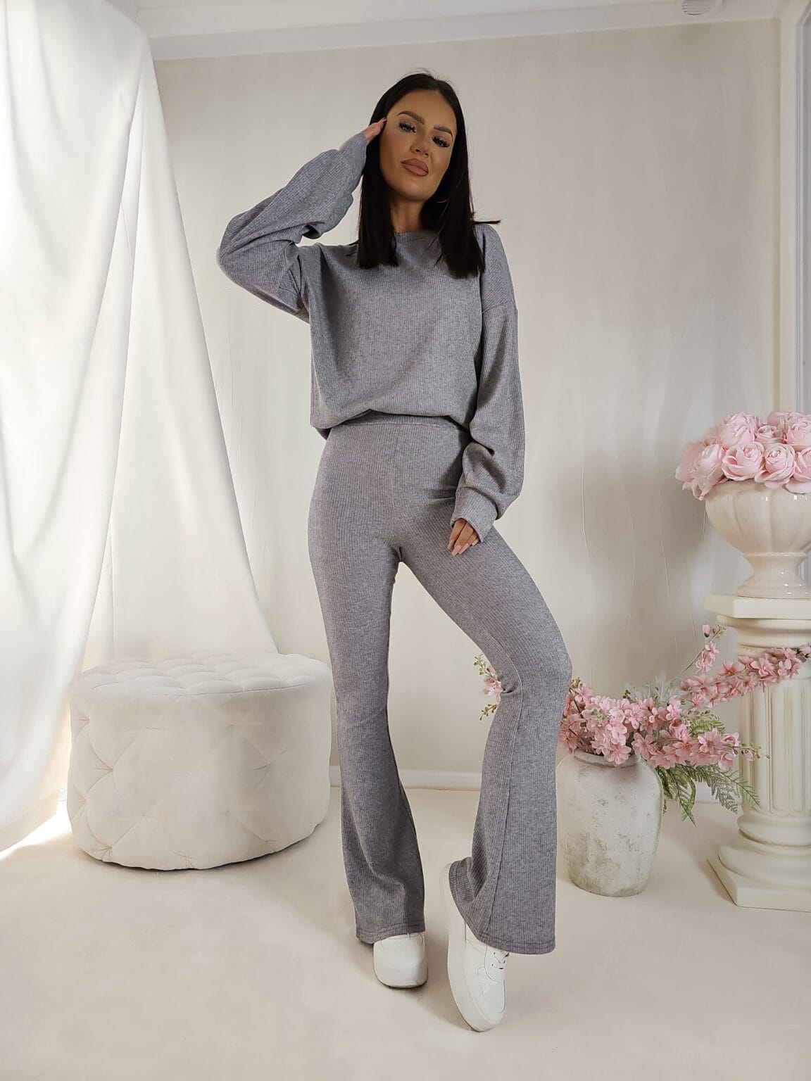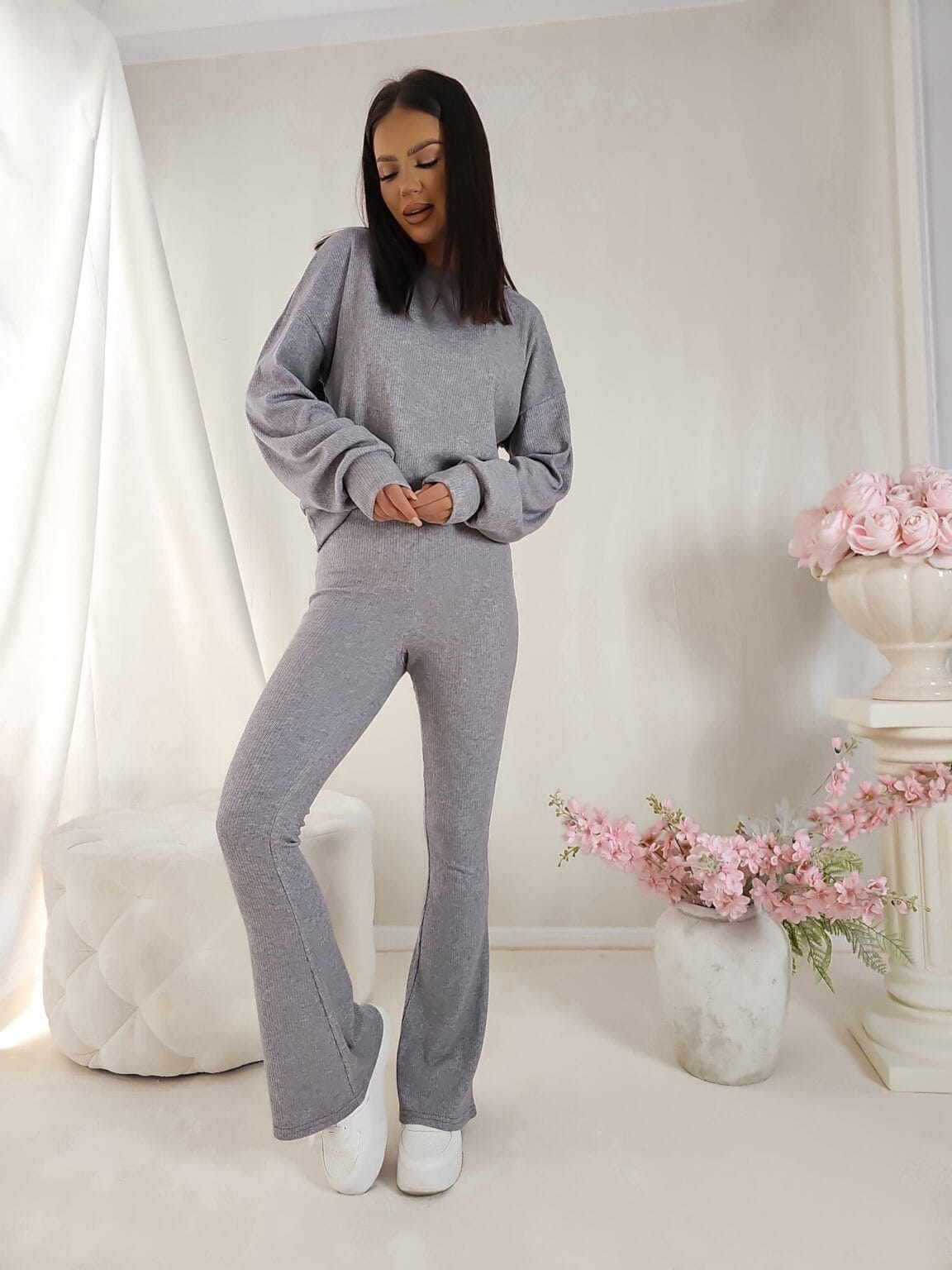Luźniejsza bluza oraz spodnie typu dzwony z gumką w pasie.