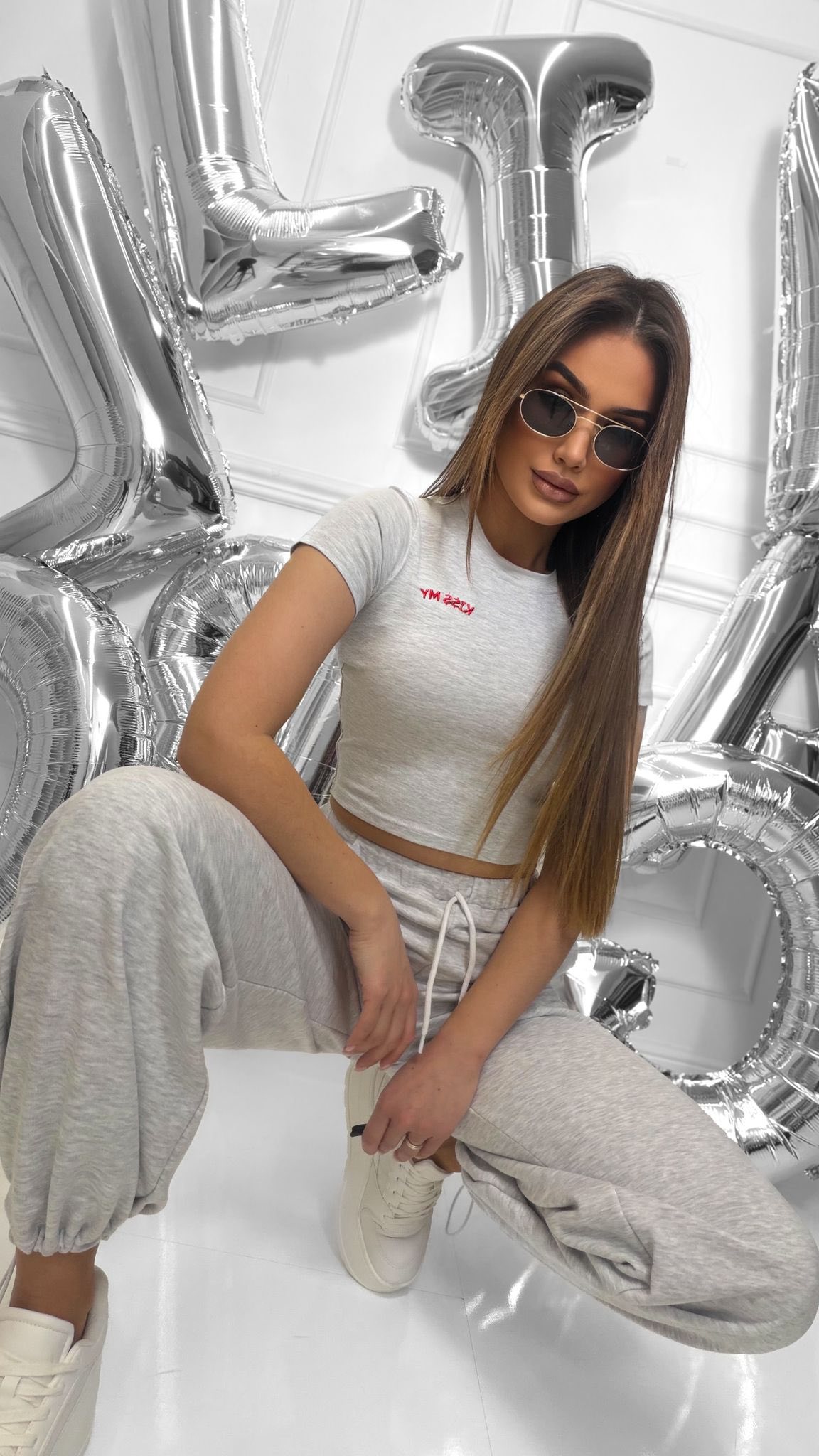 Krótki top z krótkim rękawem a do tego spodnie typu balloon z intrygującym napisem z tyłu.