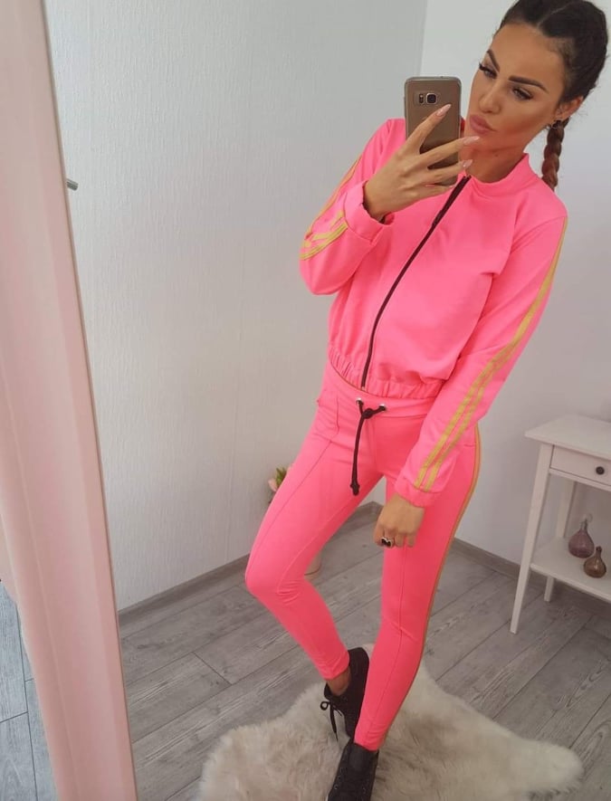 Spodnie z gumką w pasie, bluza zapinana na zamek, modne lampasy po bokach.