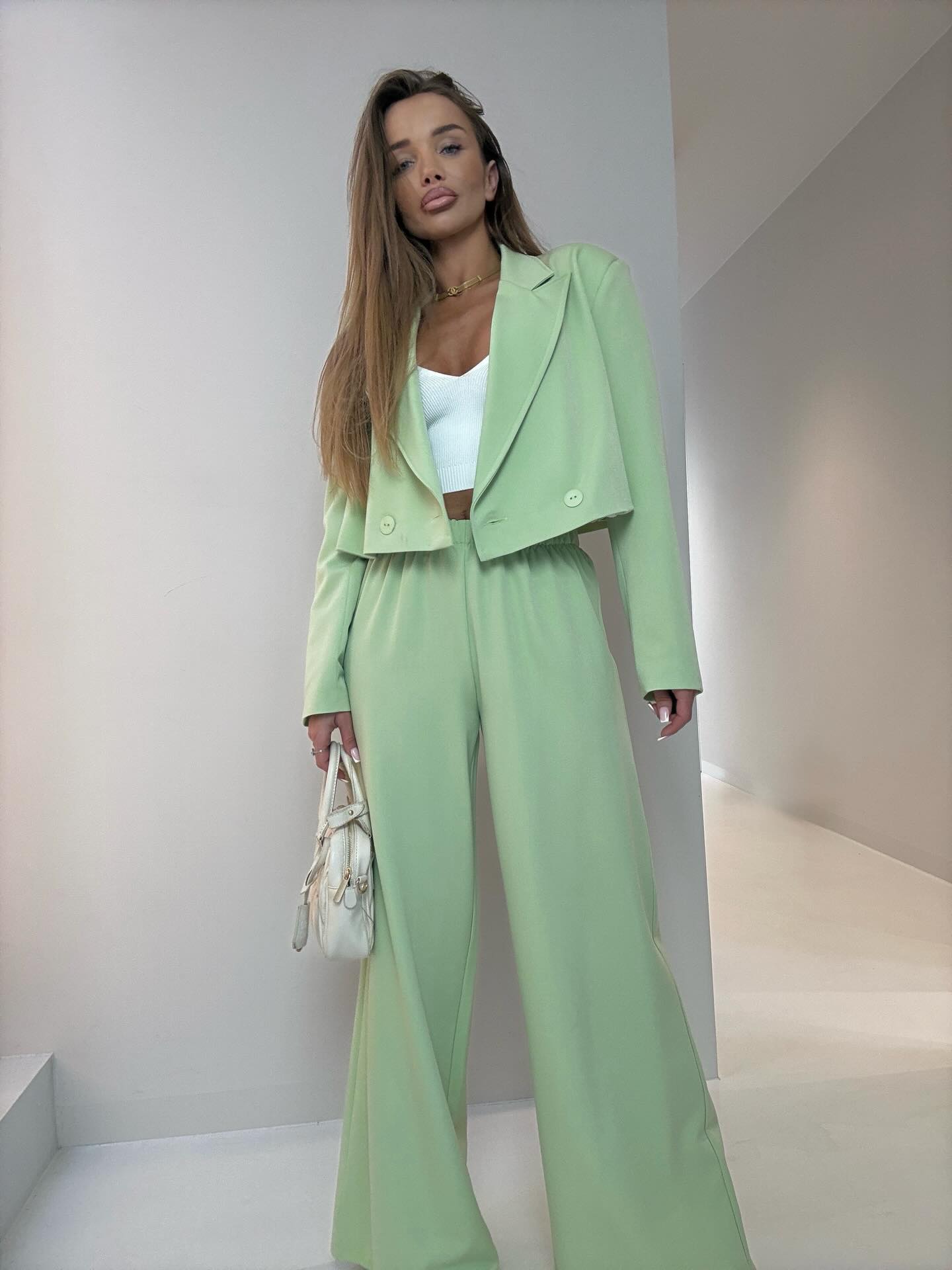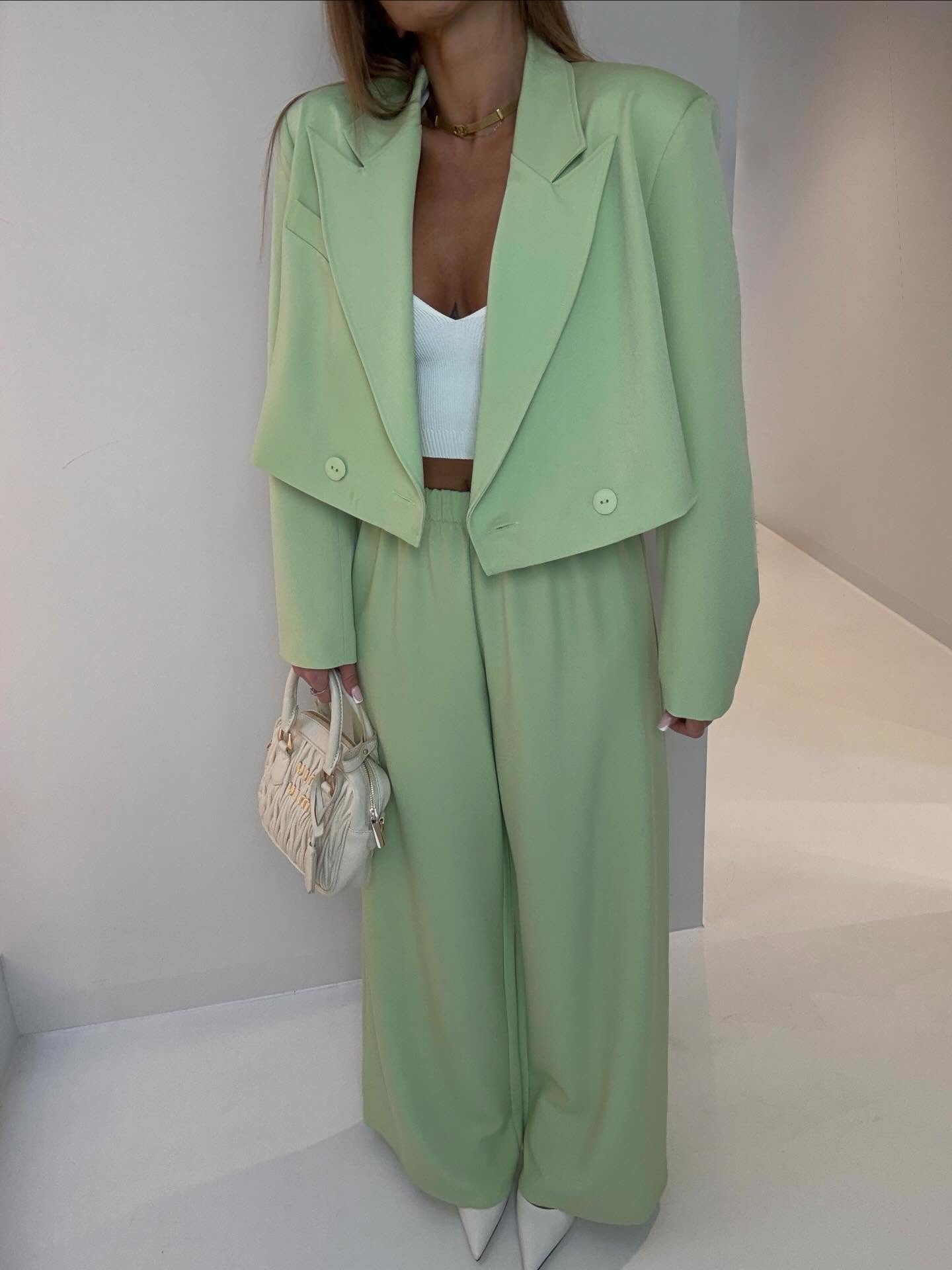 Niezwykle wygodny a za razem elegancki komplet składający się z krótkiej marynarki zapinanej na guzik oraz spodni z gumką w pasie i prostą nogawką.