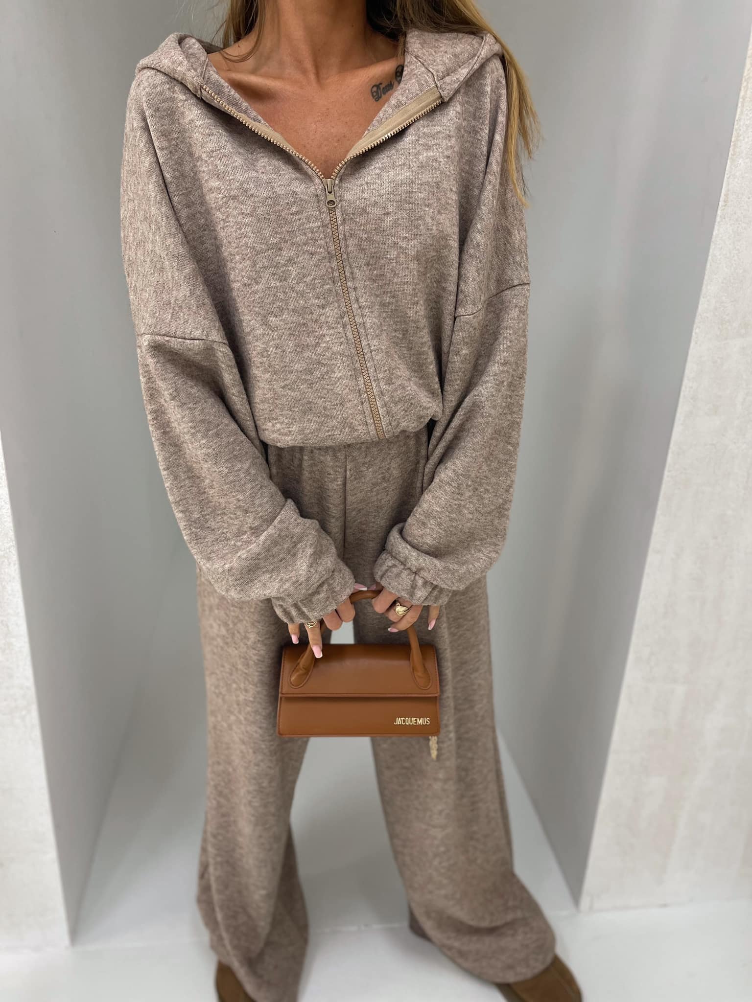 Komplet składa się z bluzy zapinanej na zamek oraz spodniami z prostą nogawką oraz wysokim stanem.
