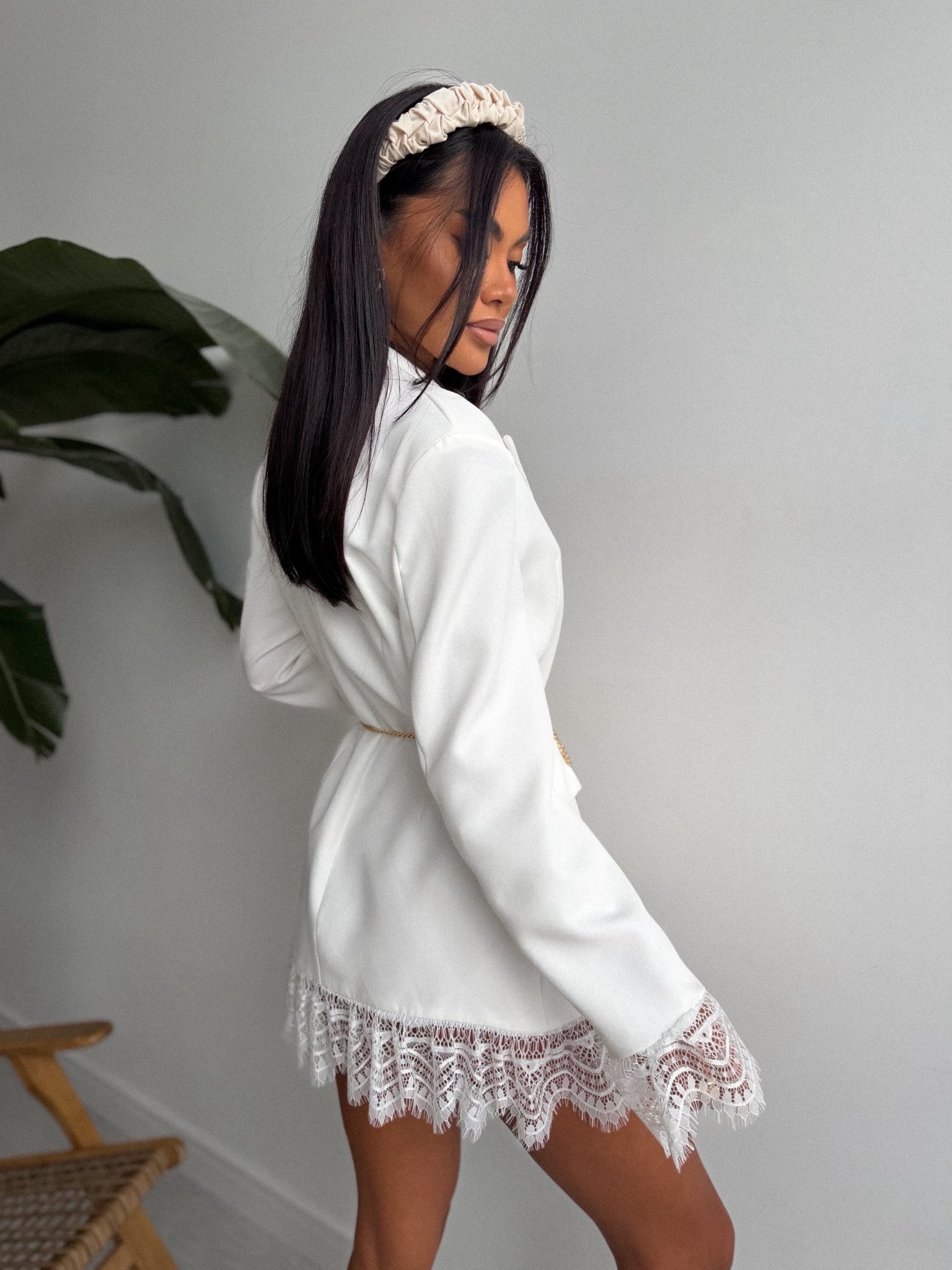 Niezwykle elegancka marynarka z koronkowym wykończeniem przy rękawach oraz na dole.