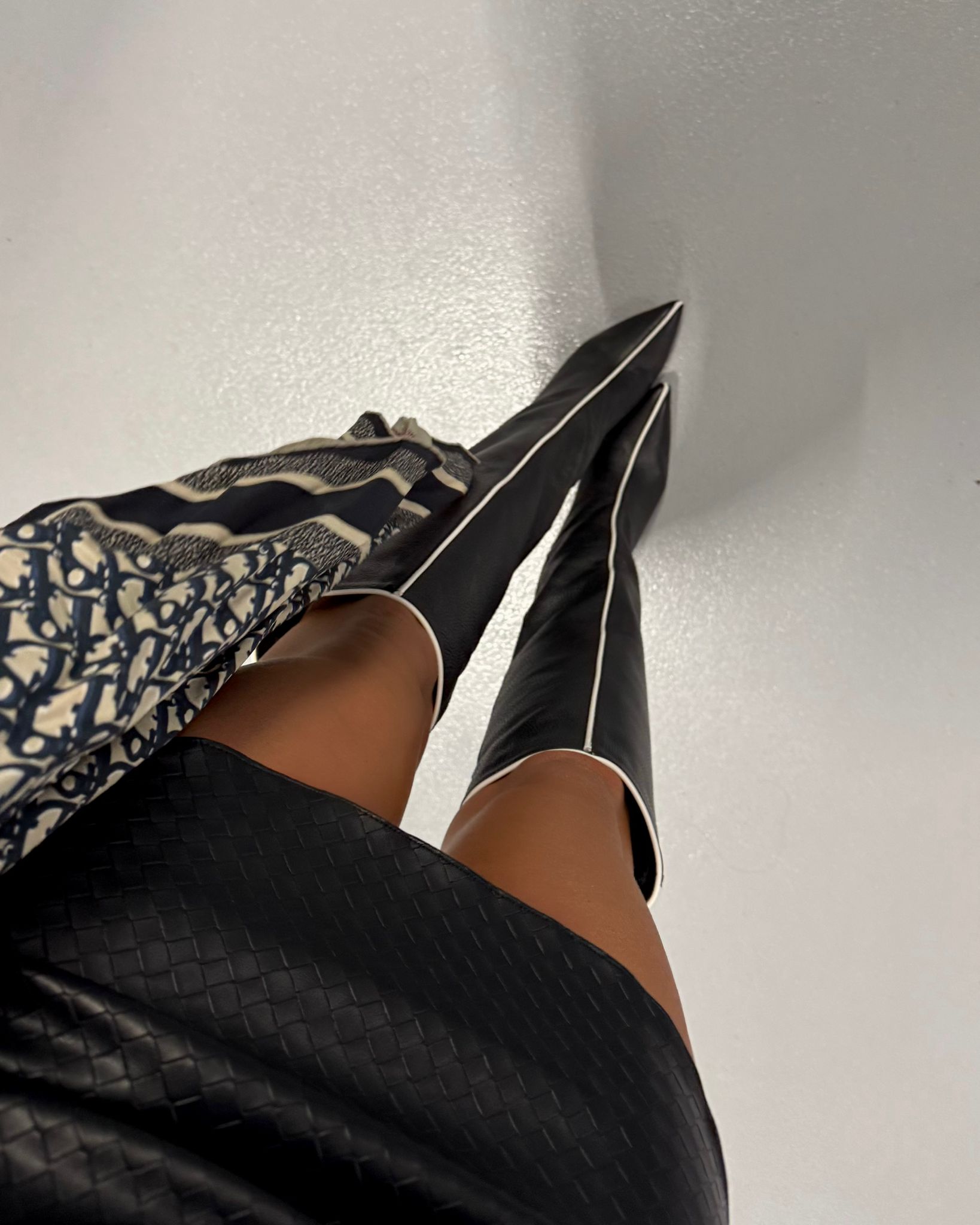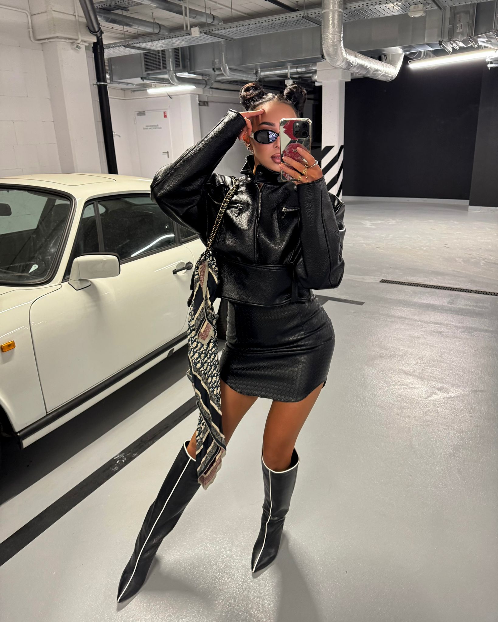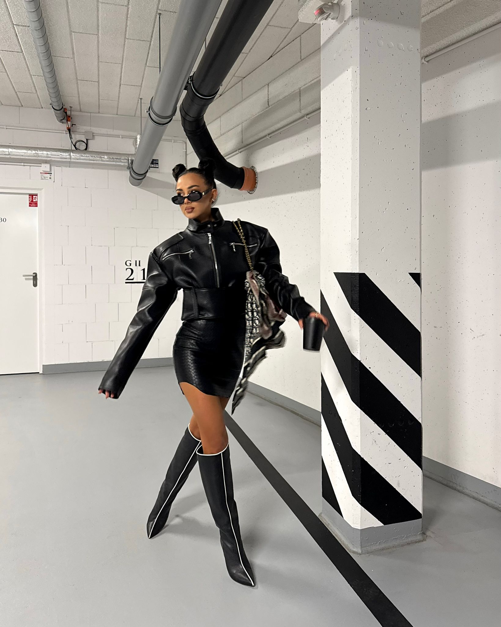 Elastyczny materiał, wycięcie po bokach dzięki czemu optycznie wysmukli twoje nogi a skórzane wykończenie dodaje charakteru całej stylizacji.