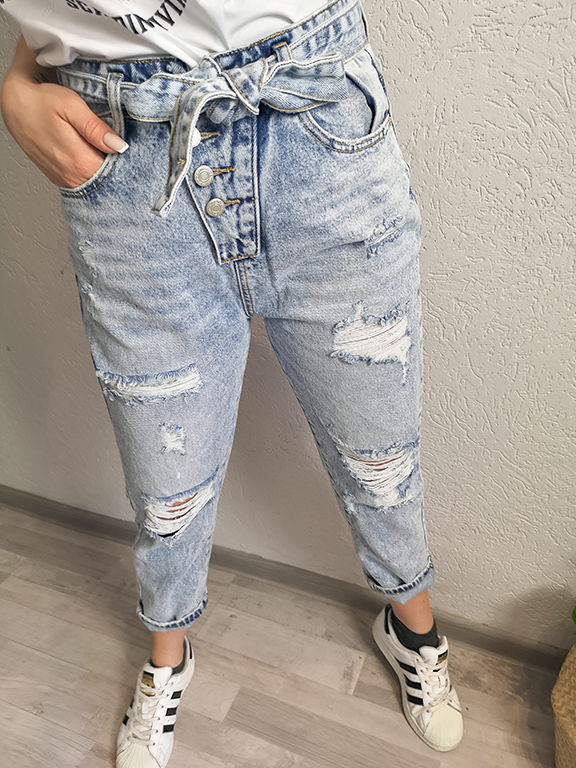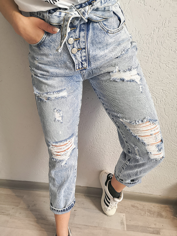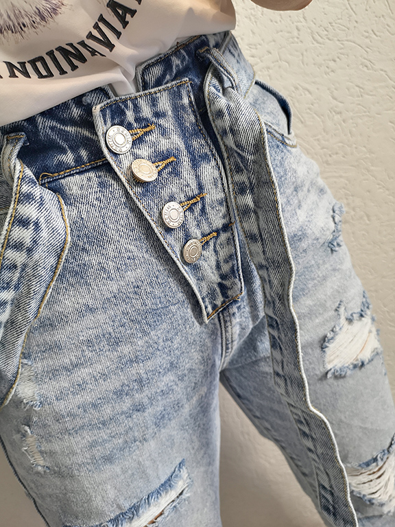Wyższy stan, modne przetarcia oraz dziury na nogawkach, nietypowe zapięcie na guziki.