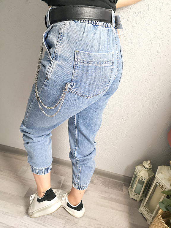 Wysoki stan, szerokie nogawki zakończone ściągaczem na dole.