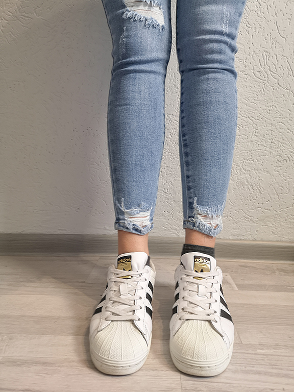 Modne przetarcia na nogawkach, delikatnie wyższy stan, elastyczny materiał.