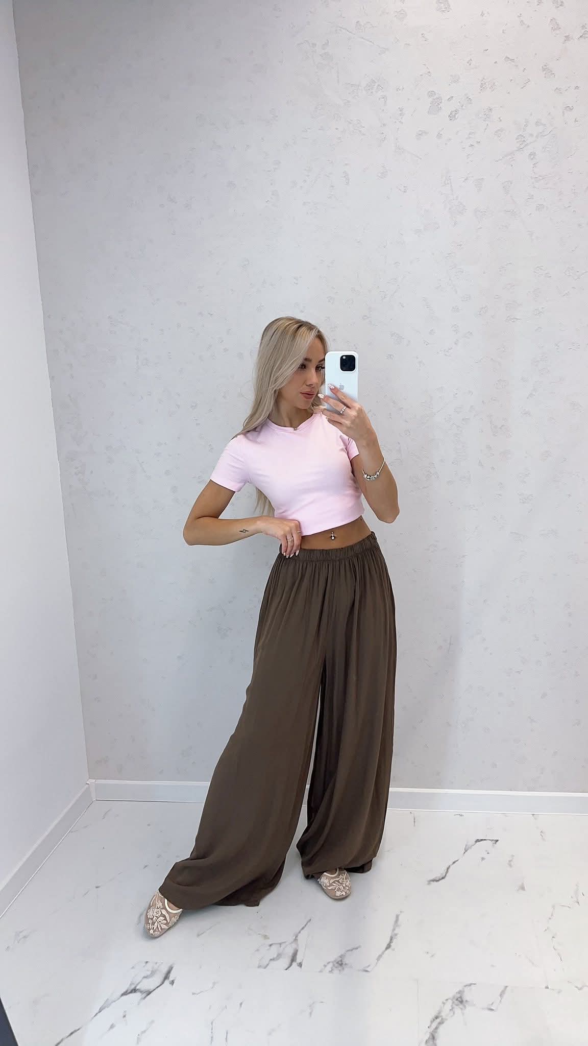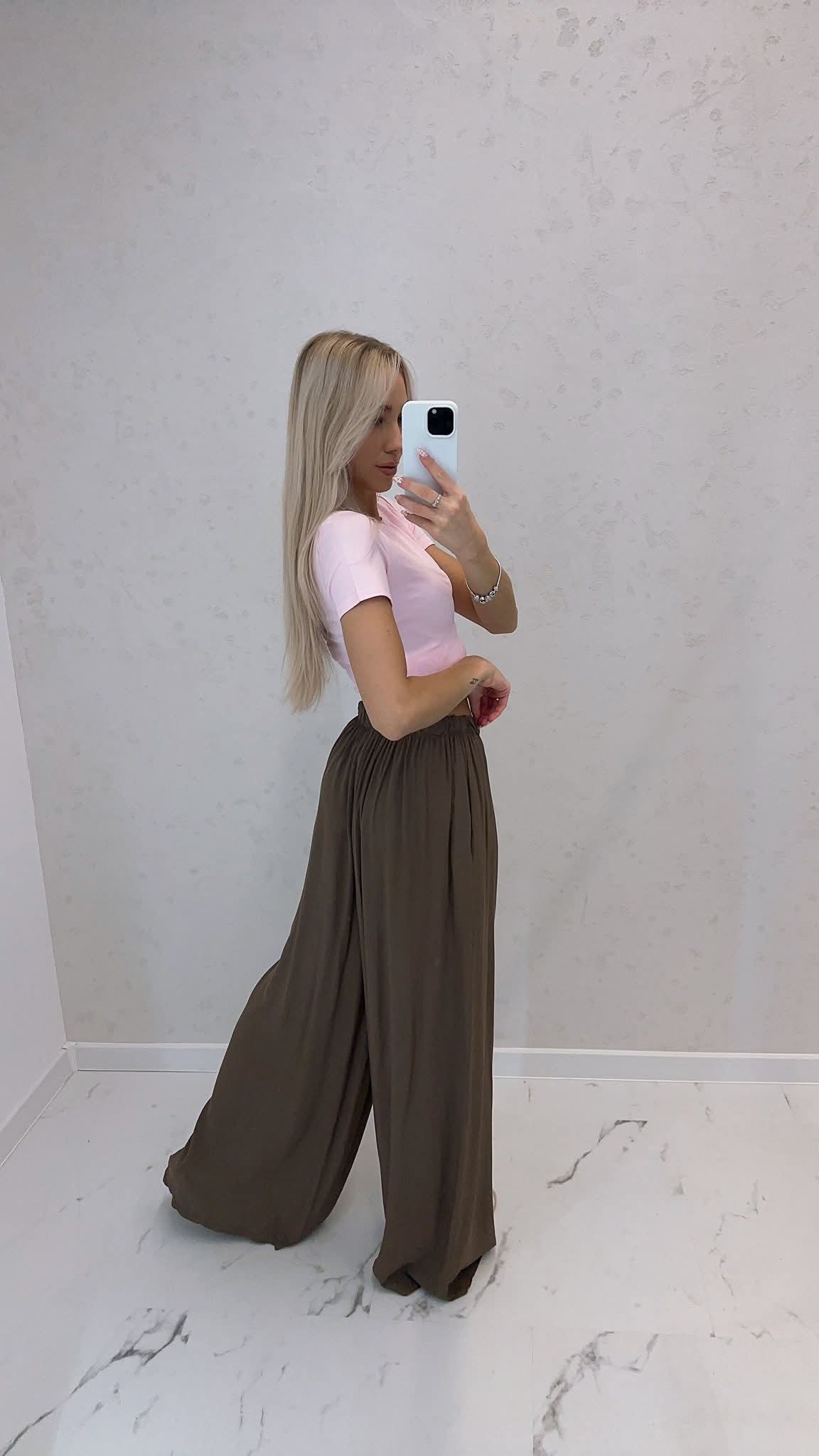 Szeroka nogawka, z gumką w pasie. Posiada kieszenie z boku.