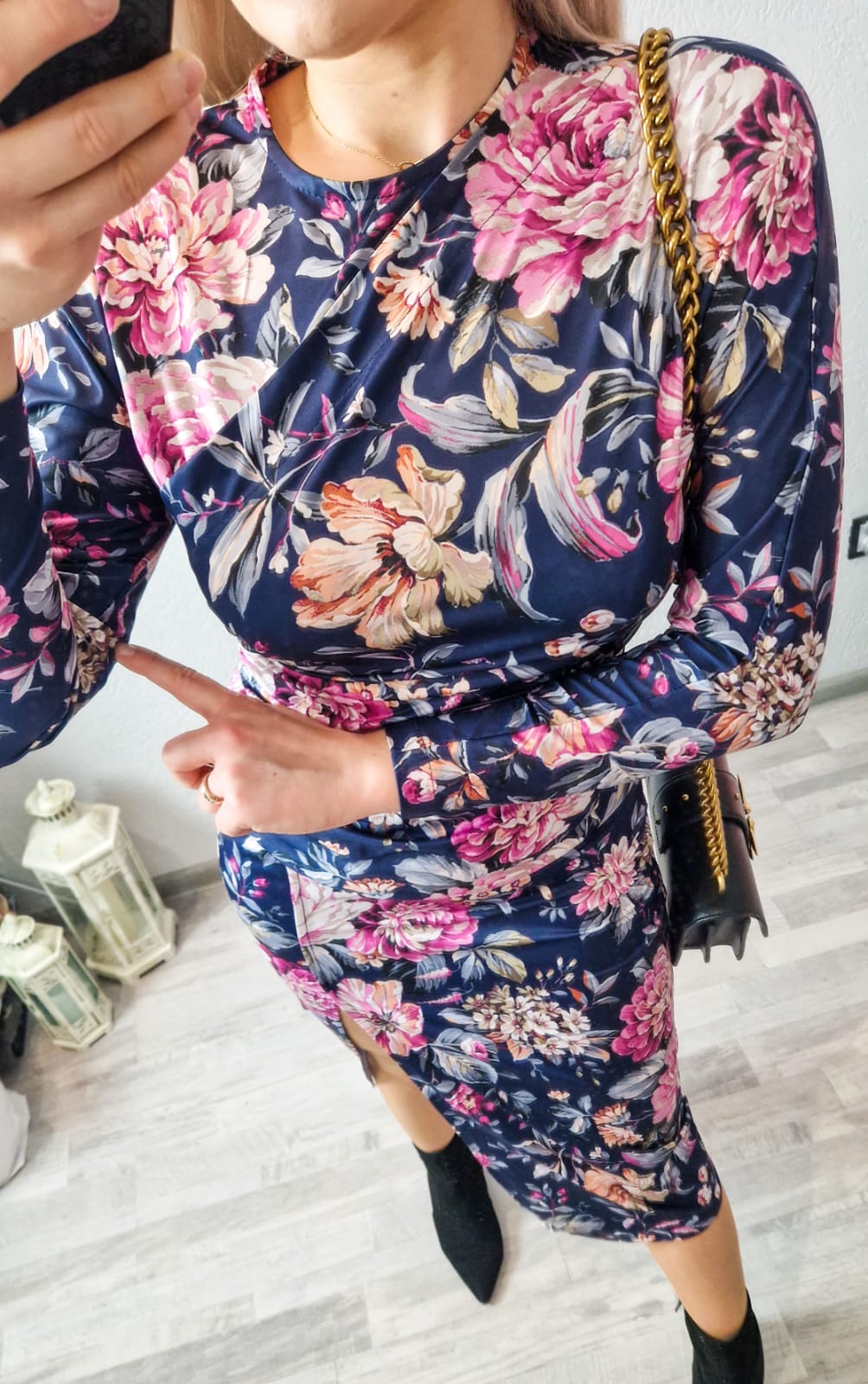 Sukienka midi w kolorze granatowym o pięknym kwiatowym wzorze.