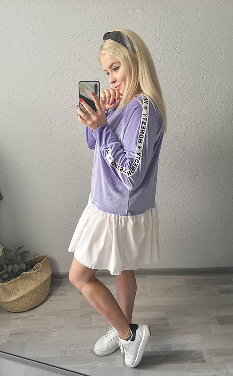Rewelacyjna sukienka welurowa wykończona białą falbanką.