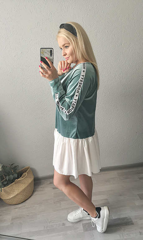 Rewelacyjna sukienka welurowa wykończona białą falbanką.