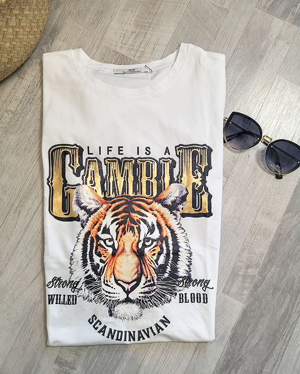 Złoto-czarne napisy oraz nadruk z tygrysem doda pazura każdej stylizacji.