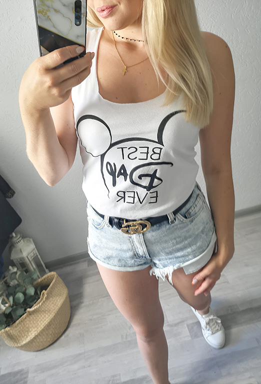 Świetnej jakości biały top z motywem Mickey oraz czarnym napisem.